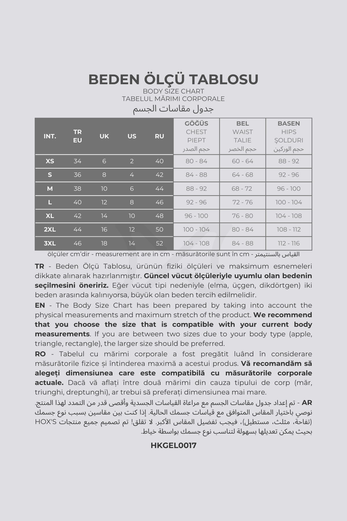 All HOX'S branded products are under our company's warranty. All product photographs on our website were taken in our own studio with original products. Representative photographs are not used on our site. The product you purchase will arrive exactly as you see it in the product images. We do not modify product images with Photoshop or any other software. Product color tones may vary depending on the color settings of the devices you use. We produce all our products with first quality fabrics with OEKO-TEX STANDARD 100 and TSE certificates.