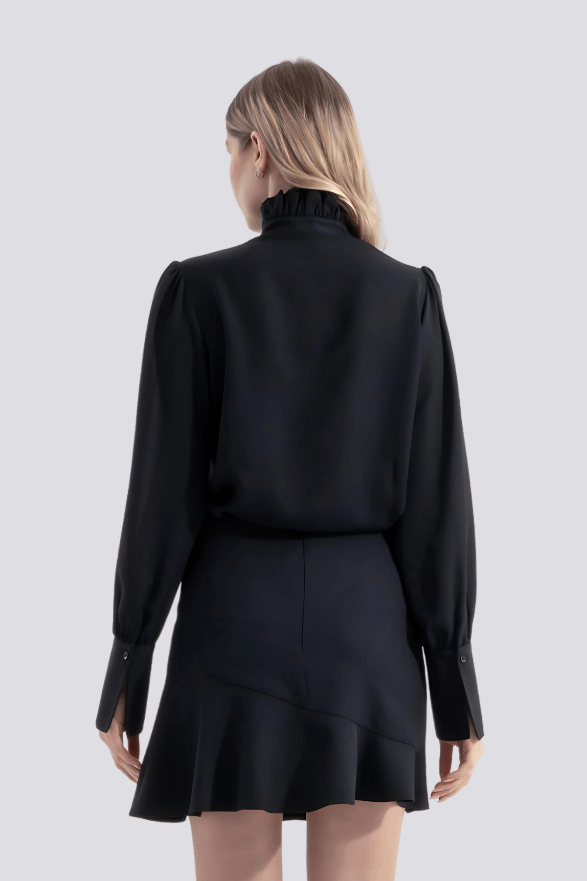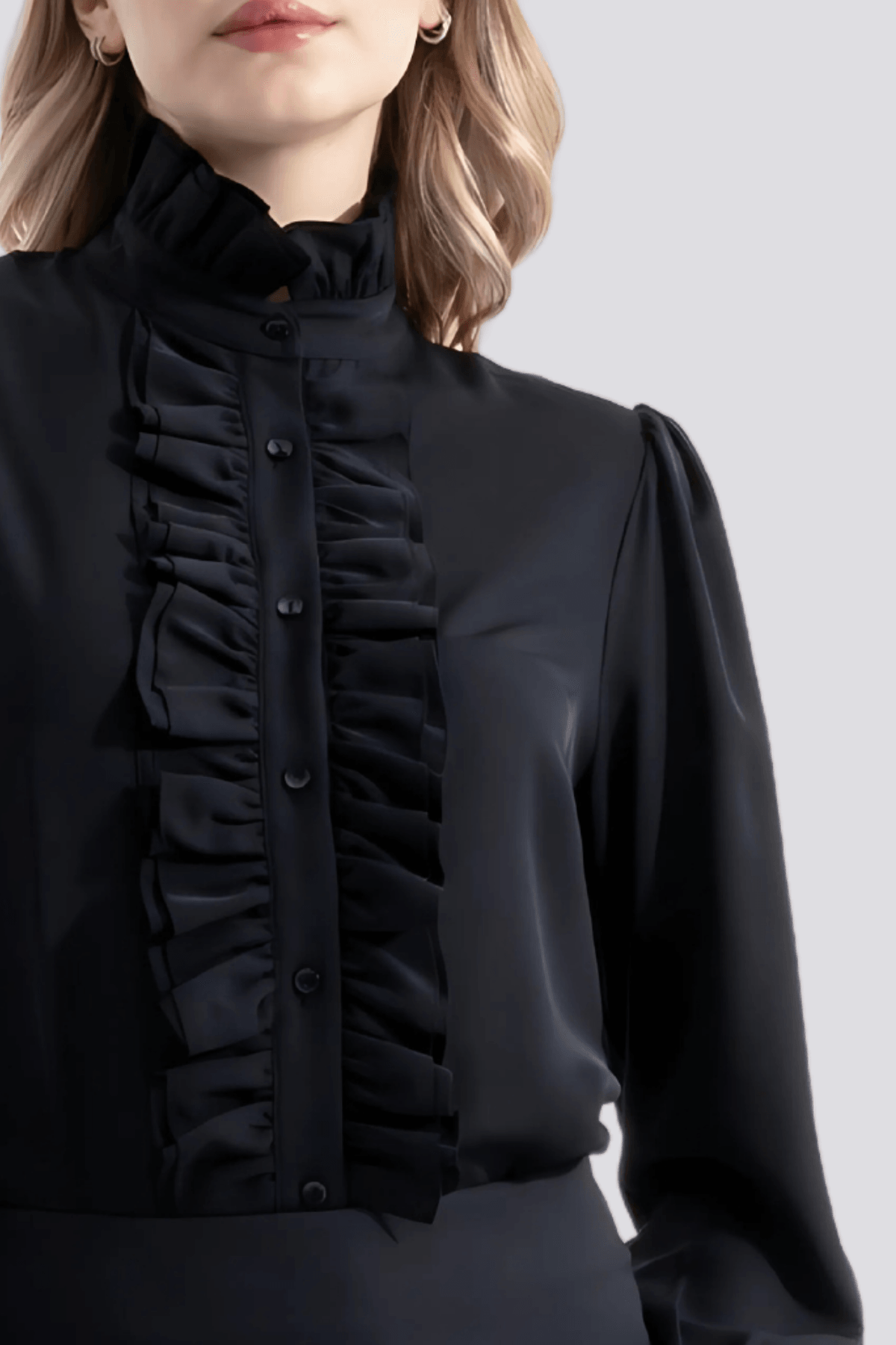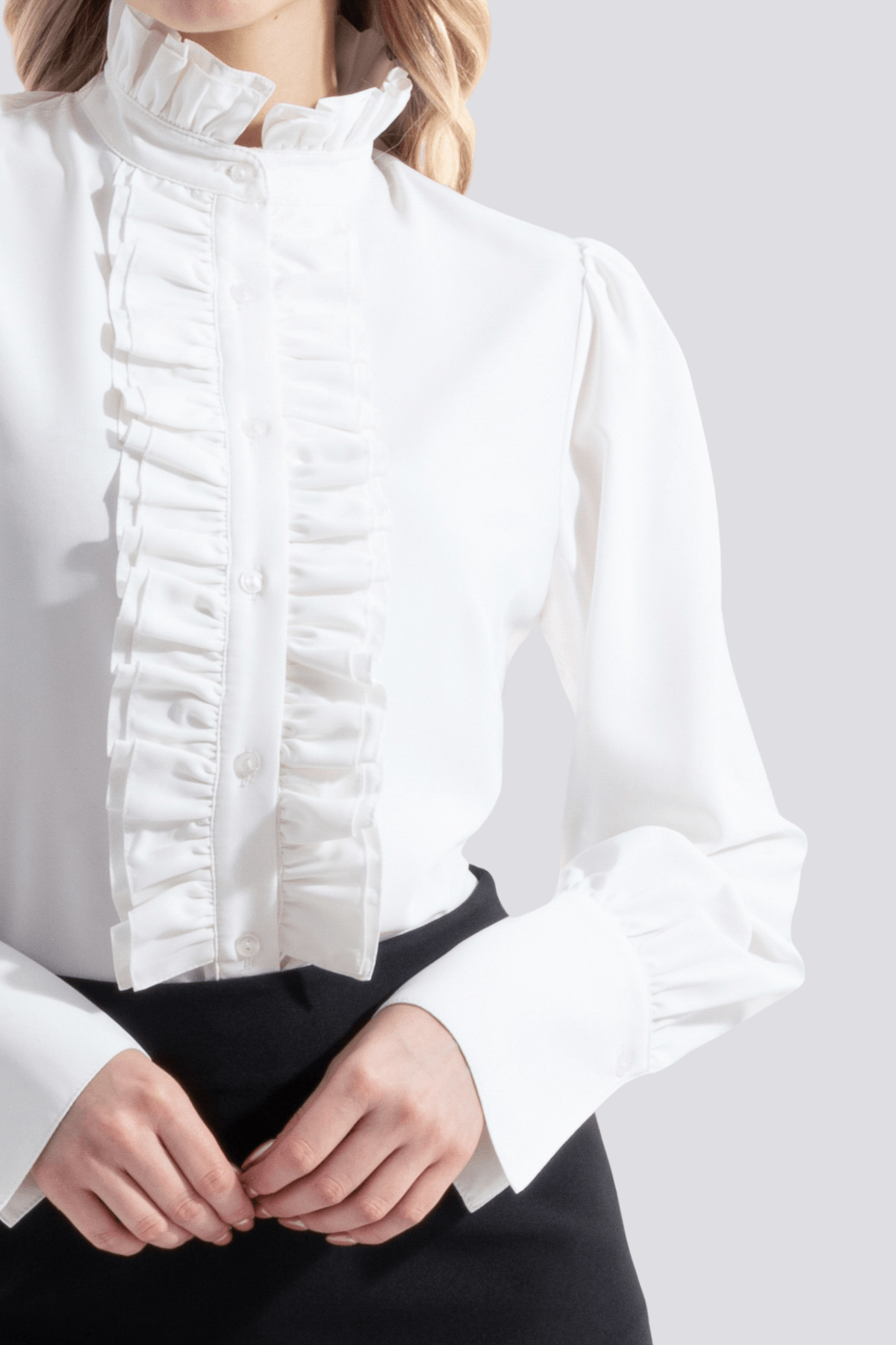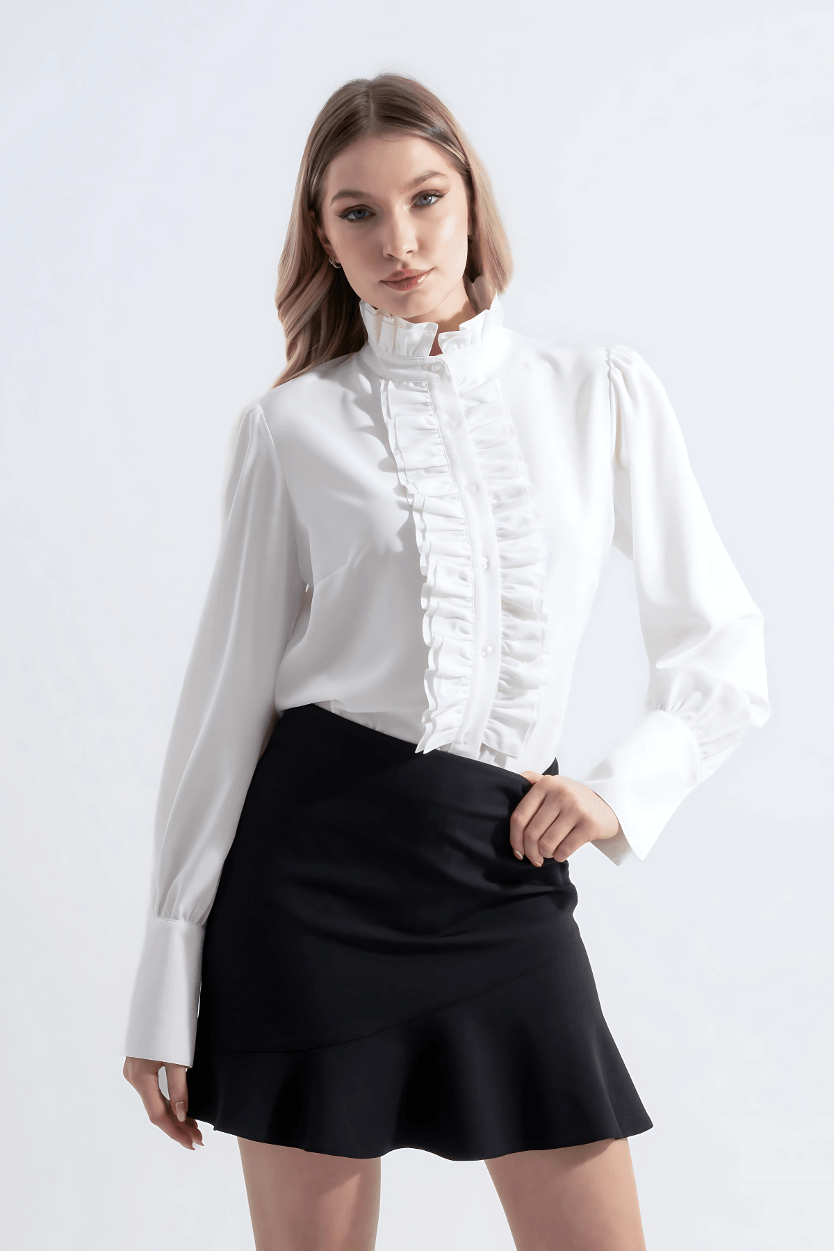 This unique, iconic design, flawless chest fit and silky fabric, this long-sleeved, ruffled shirt with a grandad collar and cuffs, is designed to make you the star of your environment. The product will be an indispensable part of your wardrobe as an option that will accompany you comfortably at all kinds of invitations as well as office wear.