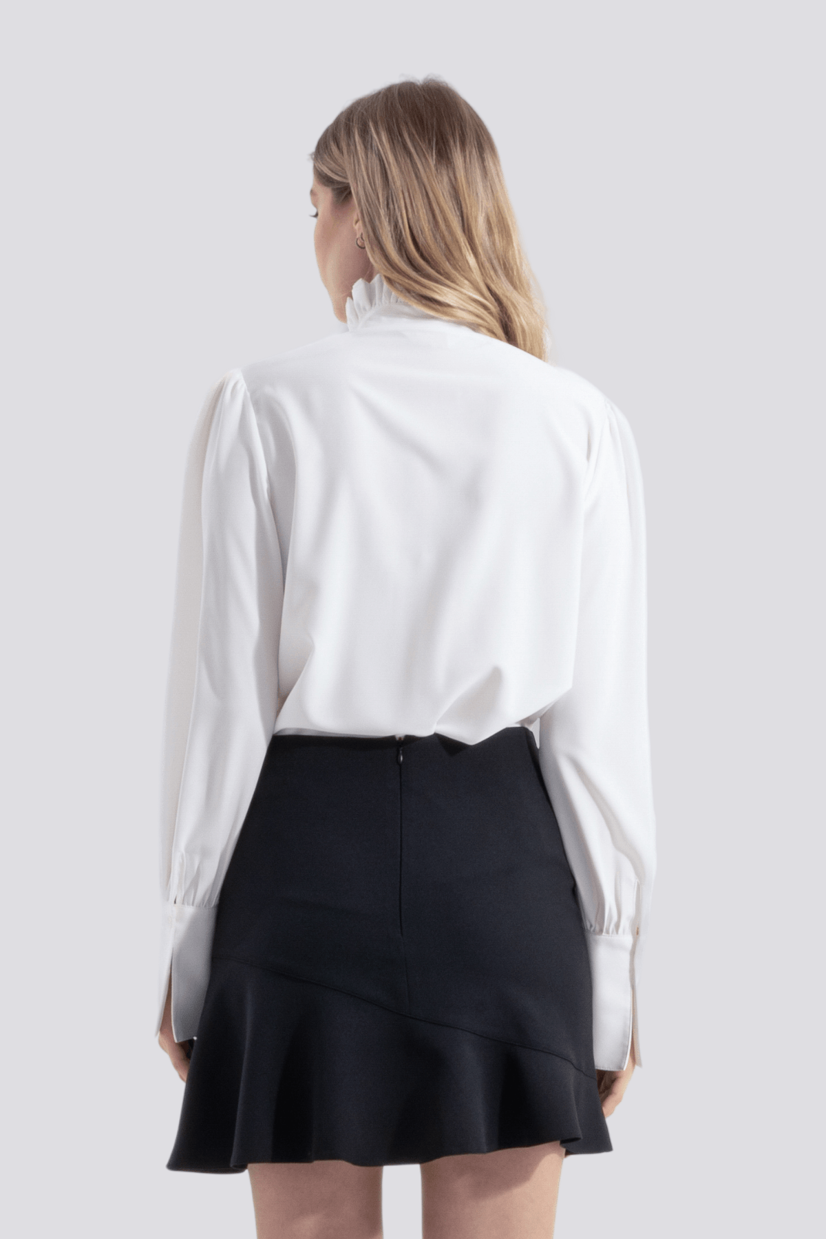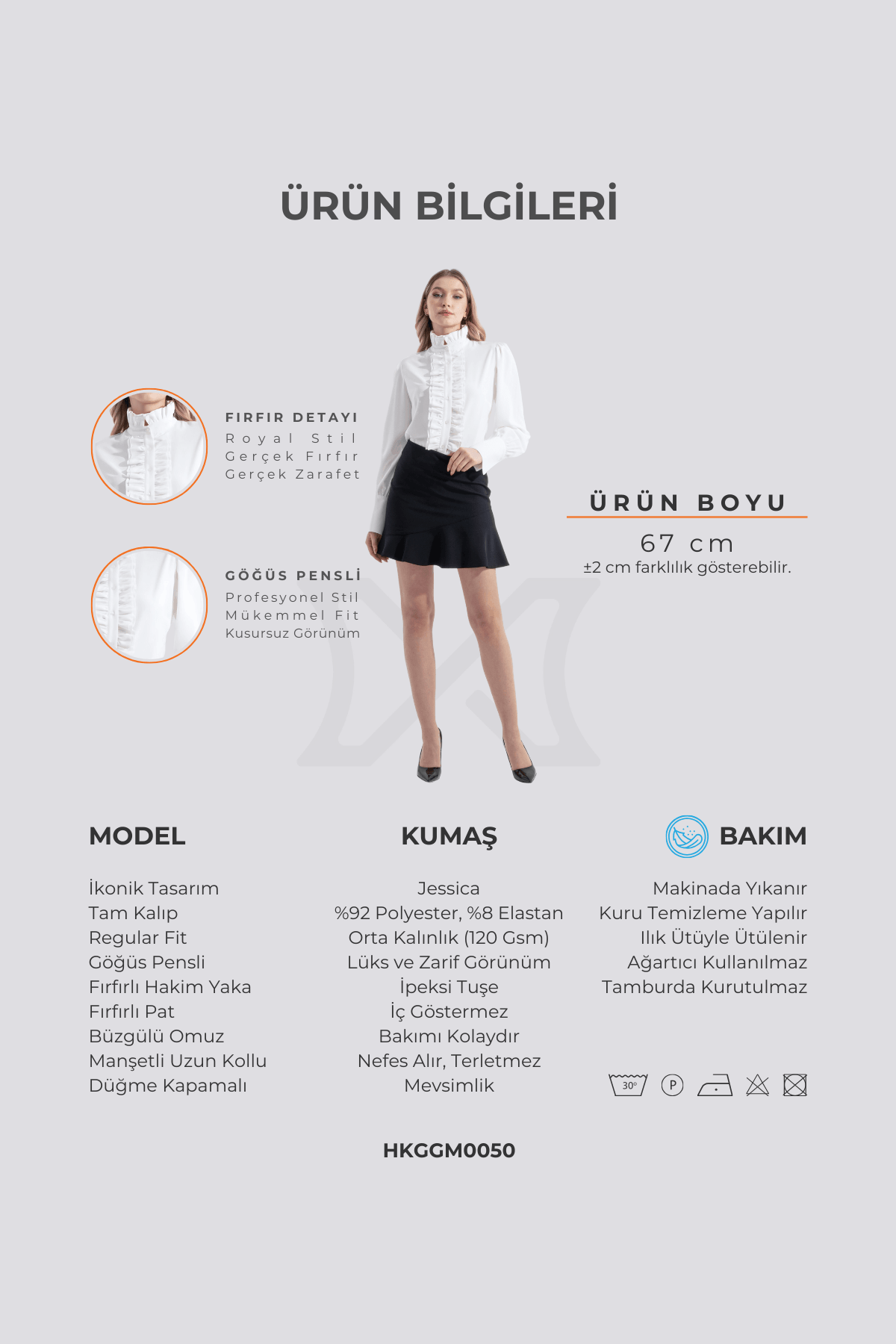 [Product Information] Designed for a comfortable use experience, this premium shirt is produced with a full mold, regular fit, ruffled mandarin collar, gathers on the shoulders, chest darts, cuffed long sleeves, ruffled placket and tone-on-tone acrylic buttons and is a very stylish piece with a feminine and elegant style. The ruffles are created by folding the fabric and fixing the edges with lawn stitching, no overlock stitch is used. This shirt was produced with a zero-error approach at HOX'S facilities in Istanbul, using carefully selected high-quality materials, with mastery coming from an ancient tradition. Each HOX'S product is a valuable work of art. The product is folded with dust-free kraft cardboard and placed in packaging gelatin and delivered to its valuable user in a very stylish way in a box.