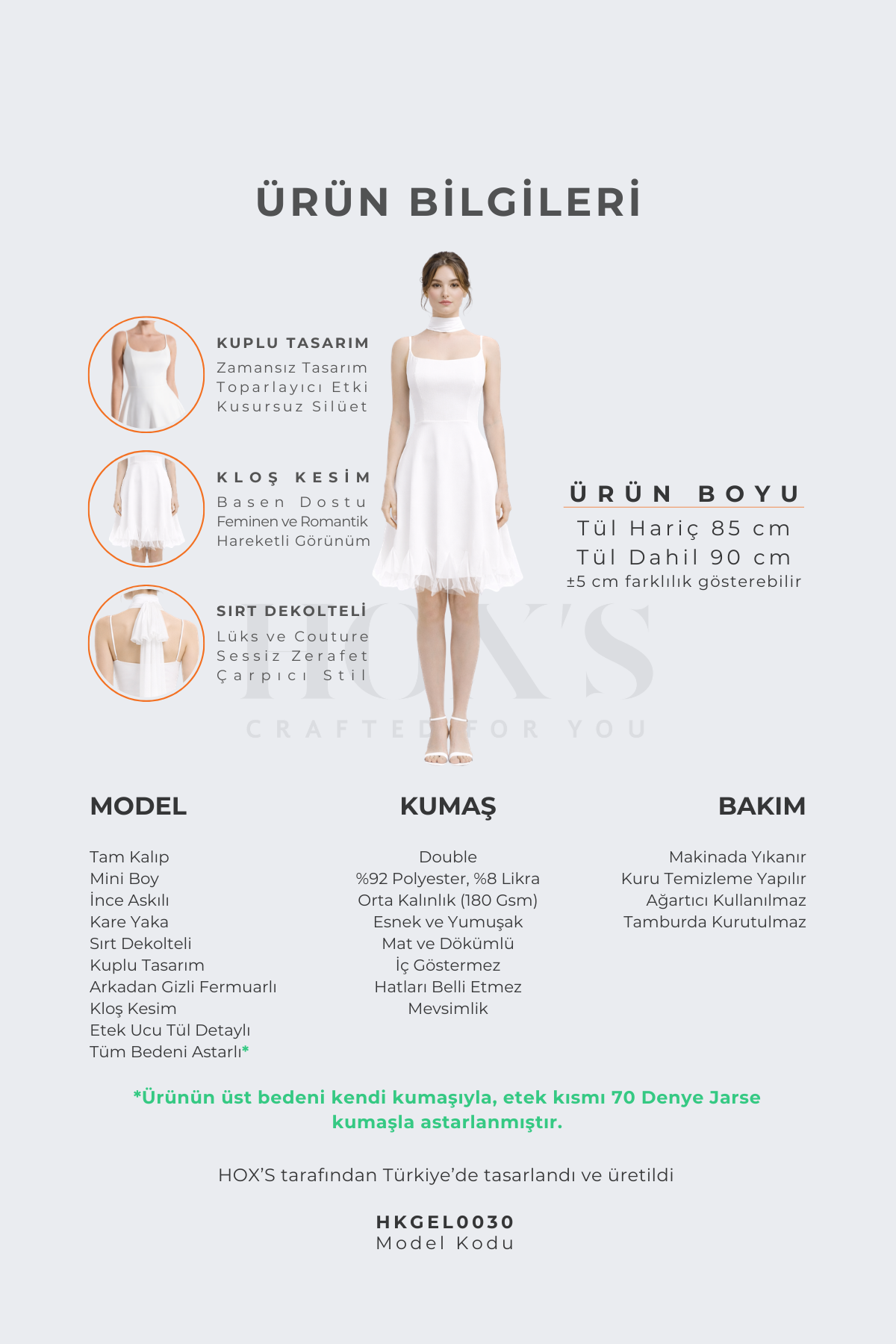 Konforlu bir kullanım deneyimi için tasarlanan Katniss, mini boy, tam kalıp, üst bedeni slim fit, kloş kesim, kare yakalı, ince askılı, kolsuz, sırt dekolteli, arkadan gizli fermuarlı, etek ucu dökümlü tül detaylı ve üst bedeni astarlı (Beyaz renk ürün tam boy astarlıdır) olarak üretilmiş olup, kadınsı ve elegan tarzı olan çok şık bir parçadır. Etek ucundaki tül detayının dökümlü görünmesi için ideal sertlikte bir malzeme seçilmiş, eteğe 12 noktadan sabitlenerek alev efekti oluşturulmuştur. Ürün, özenle seçilmiş yüksek kaliteli malzemeler kullanılarak, kadim bir gelenekten gelen ustalıkla İstanbul'daki HOX'S tesislerinde sıfır hata yaklaşımıyla üretildi.