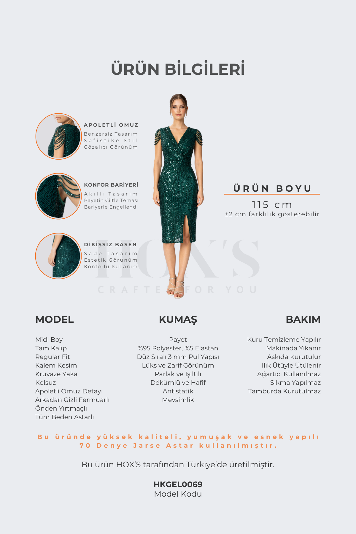 All HOX'S branded products are under our company's warranty. All product photographs on our website were taken in our own studio with original products. Representative photographs are not used on our site. The product you purchase will arrive exactly as you see it in the product images. We do not modify product images with Photoshop or any other software. Product color tones may vary depending on the color settings of the devices you use. We produce all our products with first quality fabrics with OEKO-TEX STANDARD 100 and TSE certificates.