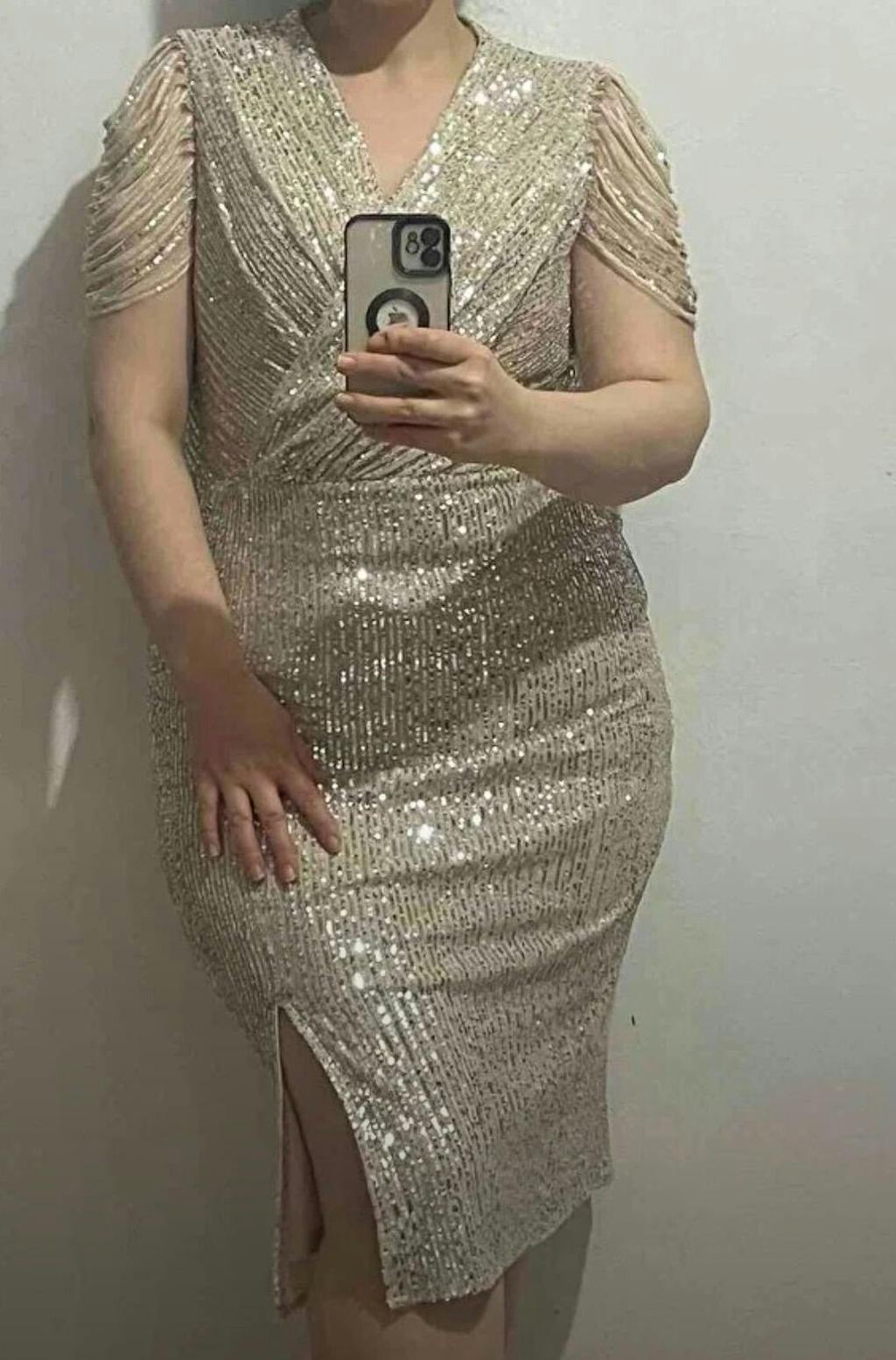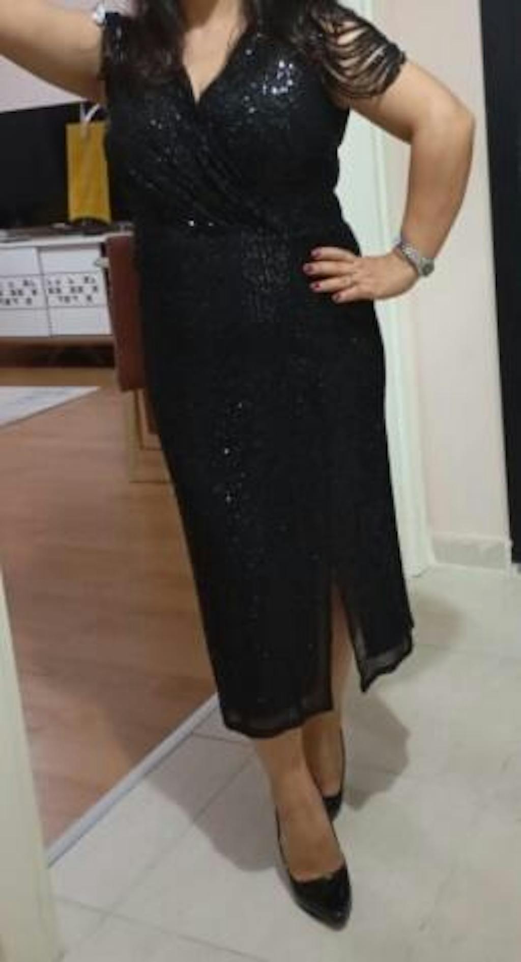 Elbiseyi çok beğendim. Bir beden büyük almama rağmen üzerimde güzel durdu. Ancak arka eteğinde kısmen ipi sökülmüş payetleri var. Renk siyah olduğundan pek belli olmuyor ama üzerimdeyken sökülme sıralı devam etmez umarım