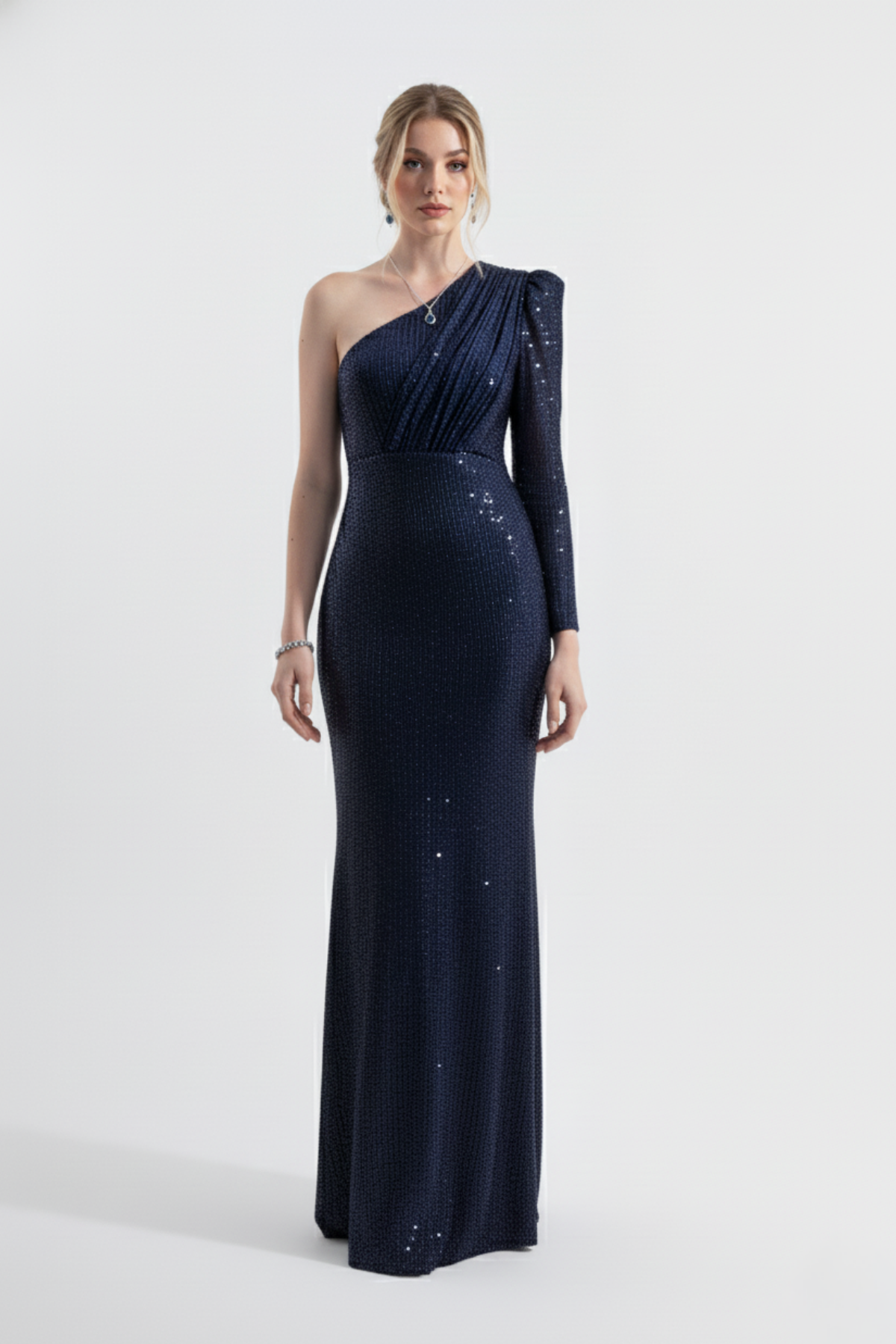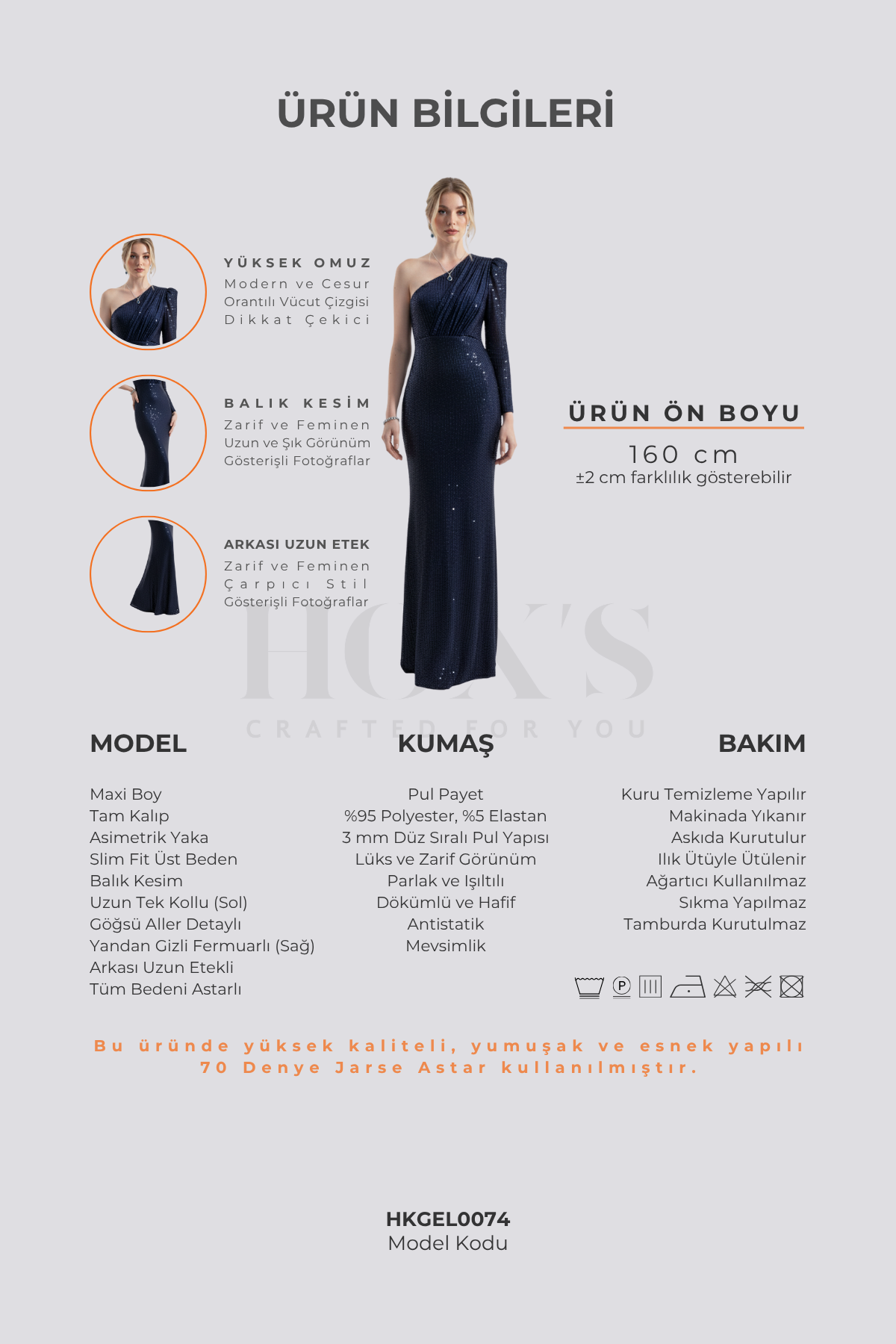 [Product Information] Designed for a comfortable use experience, this premium dress is maxi length, full mold, slim fit, fish cut, one shoulder, asymmetrical collar, single long sleeve, aller detail on the chest, hidden side zipper, long skirt on the back and fully lined and is a very stylish piece with a feminine and elegant style. This evening dress was produced with a zero error approach at HOX'S facilities in Istanbul, using carefully selected high-quality materials, with mastery coming from an ancient tradition. Each HOX'S product is a valuable work of art. This evening dress, which has a Return Security Card attached with a special clip and ribbon, is folded with dust-free kraft cardboard and placed in packaging gelatin and delivered to its valuable user in a very stylish way in a box.