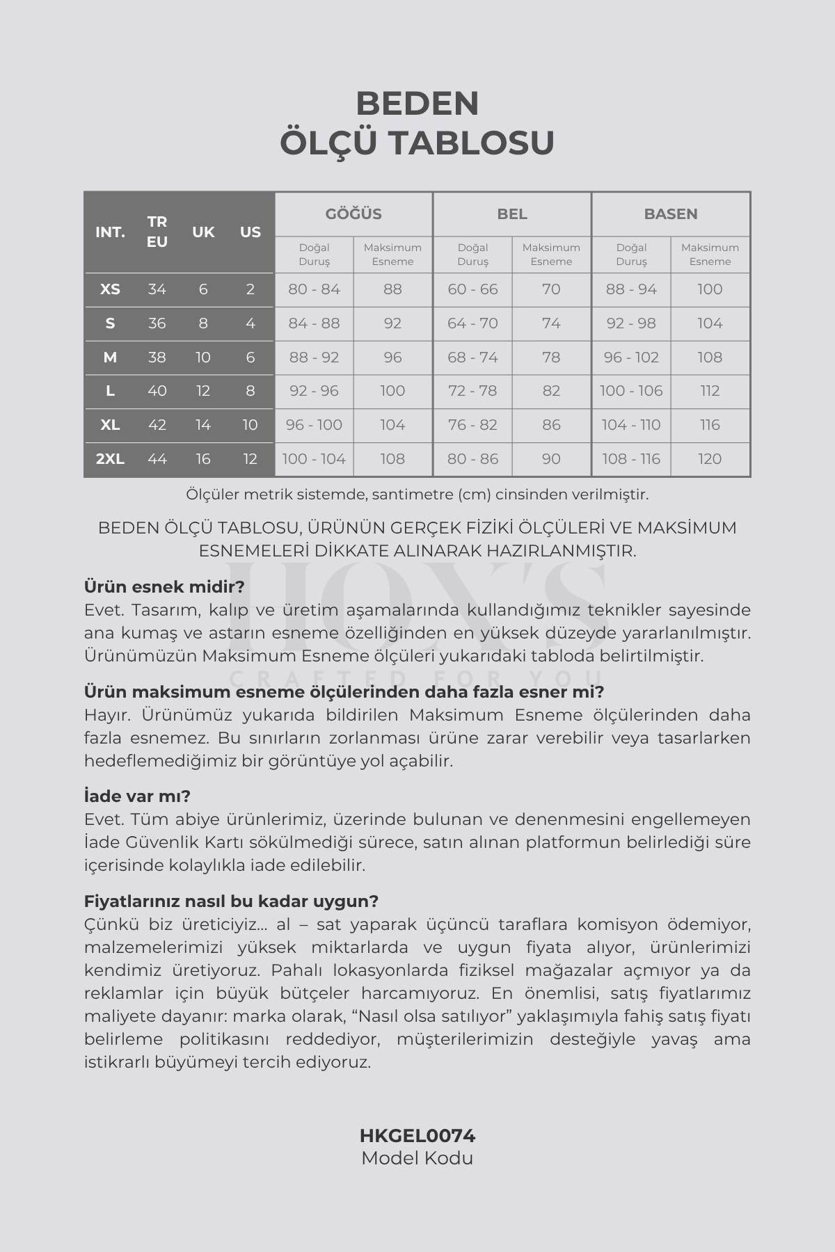 All HOX'S branded products are under our company's warranty. All product photographs on our website were taken in our own studio with original products. Representative photographs are not used on our site. The product you purchase will arrive exactly as you see it in the product images. We do not modify product images with Photoshop or any other software. Product color tones may vary depending on the color settings of the devices you use. We produce all our products with first quality fabrics with OEKO-TEX STANDARD 100 and TSE certificates.