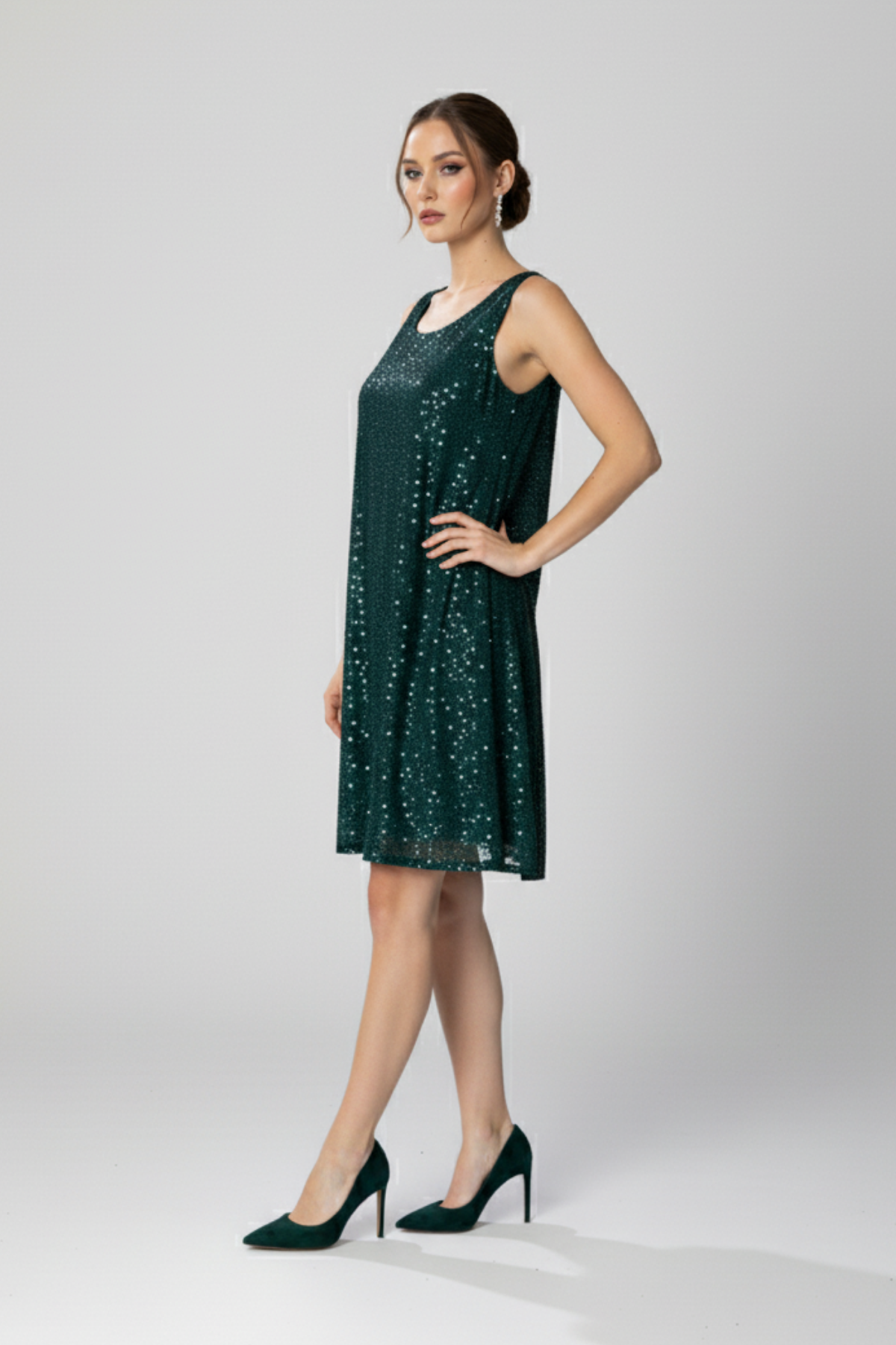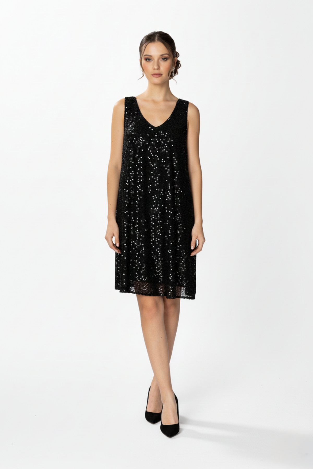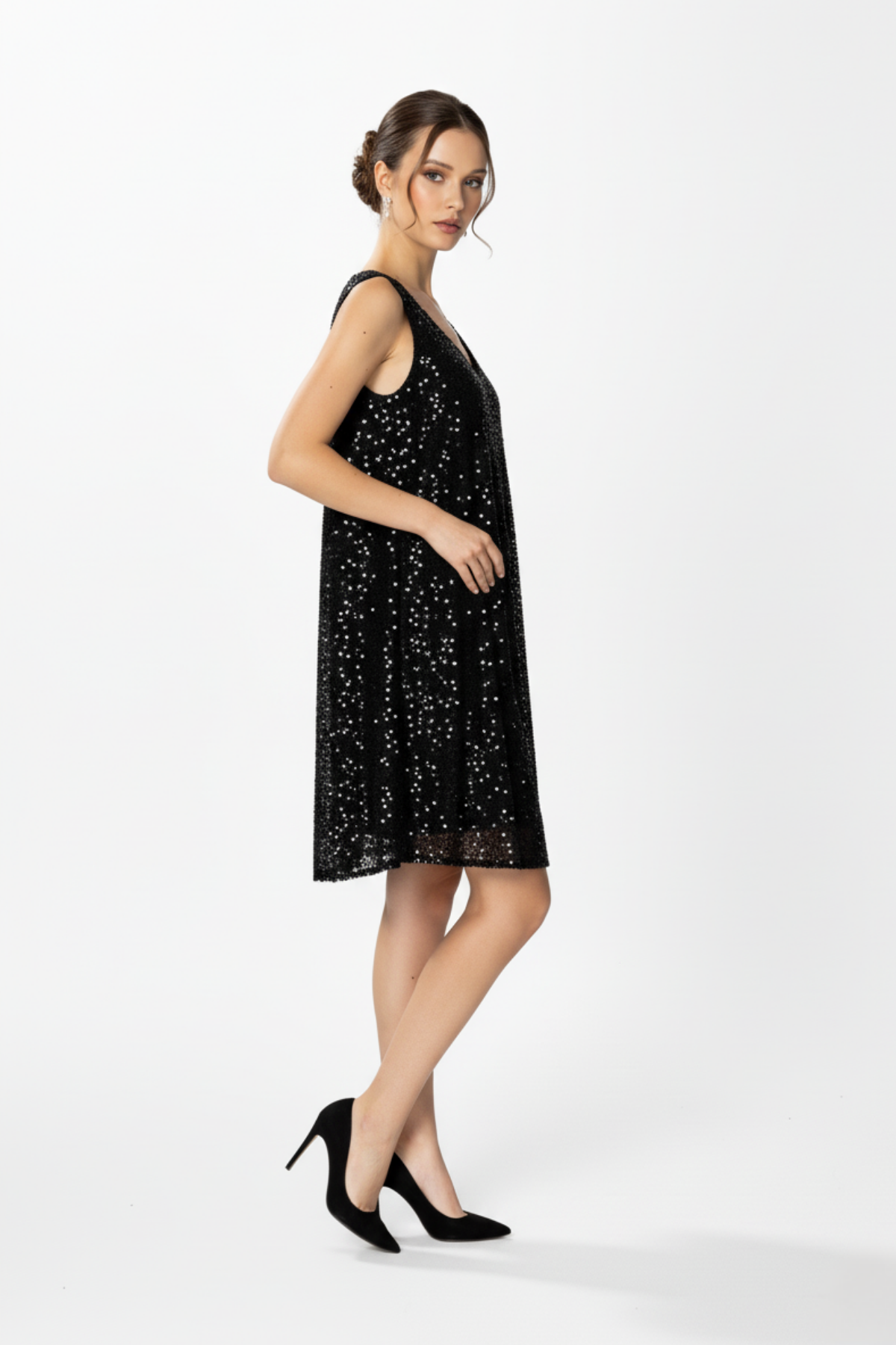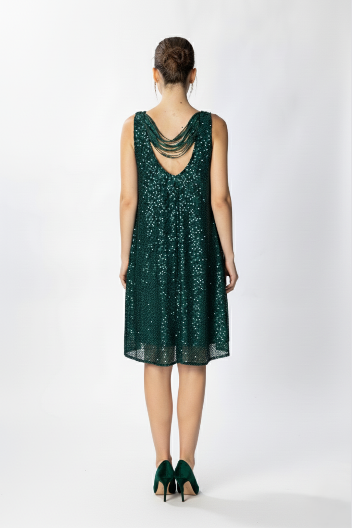 [Kumaş Bilgisi] Ürünün yüksek kaliteli ve hafif yapılı kumaşının adı Payet'tir. Kompozisyonu %95 Polyester, %5 Elastan olan kumaş ışıltılı ve dökümlü bir görünüme sahiptir. Sık şekilde düz sıralı olarak dokunmuş pullarının çapı 3 mm'dir. Bu ürünün iç kısmında, yumuşak, nefes alabilen ve esnek yapılı 70 denye jarse astar kullanılmıştır. Bu sayede son derece konforlu olan ürün iç göstermez, vücut hatlarını belli etmez ve her mevsim kullanıma uygundur.