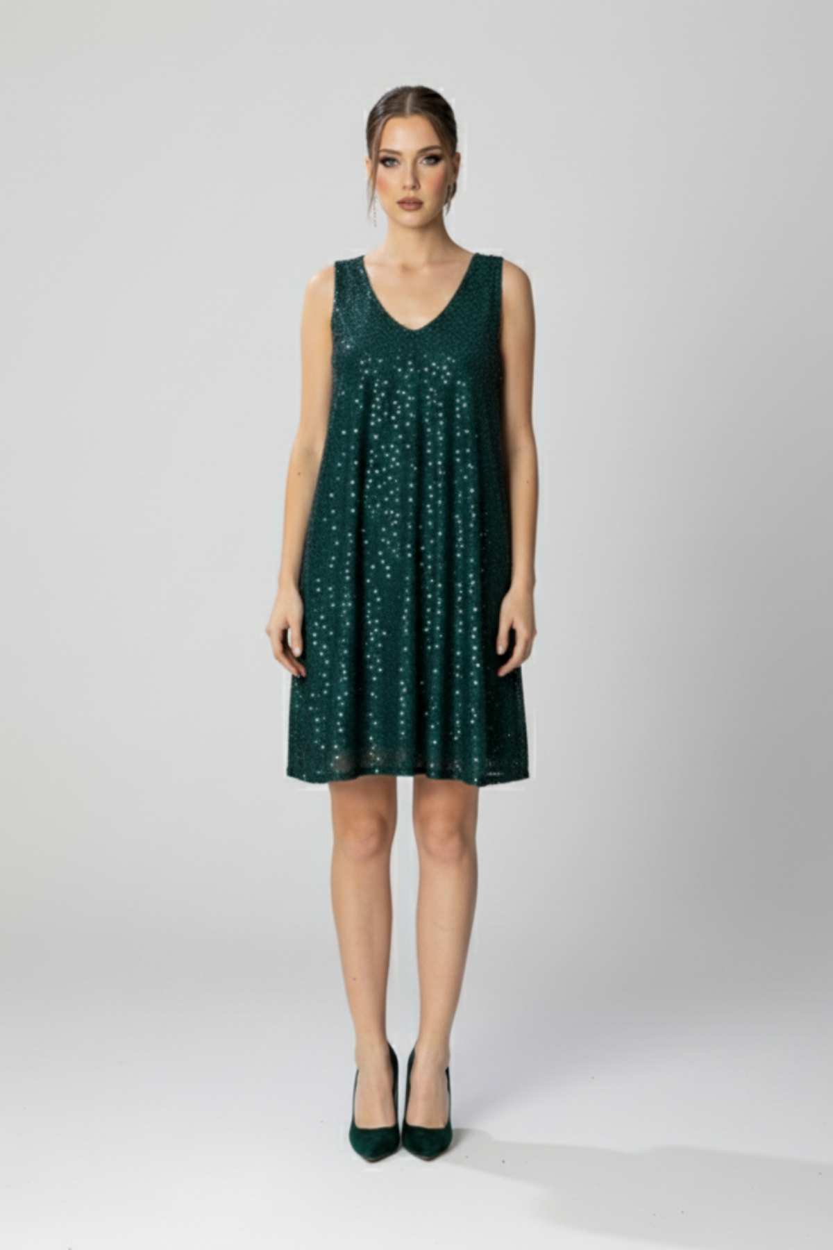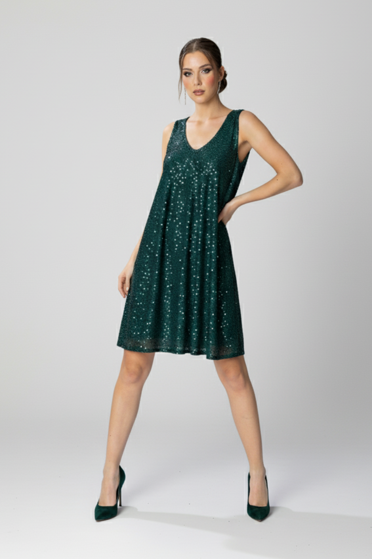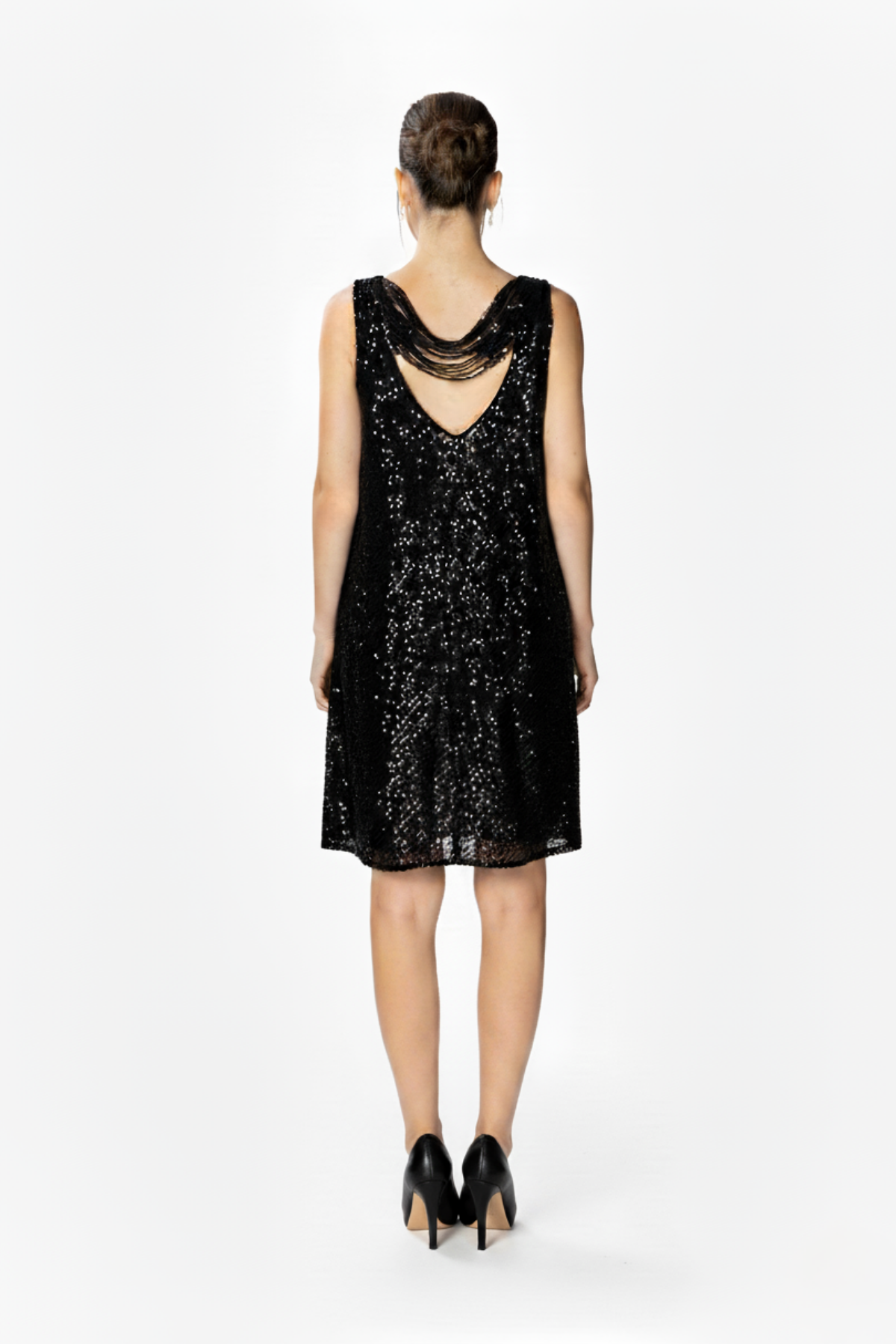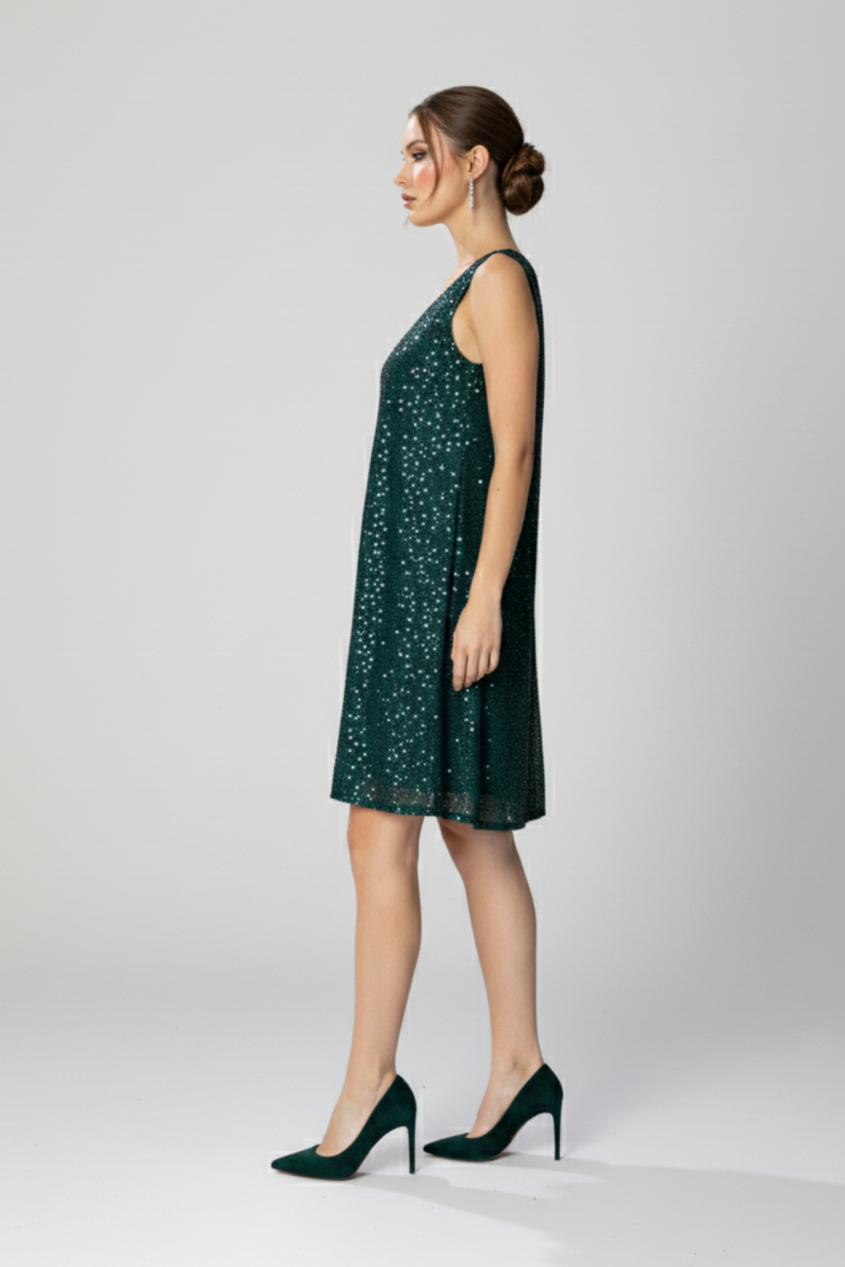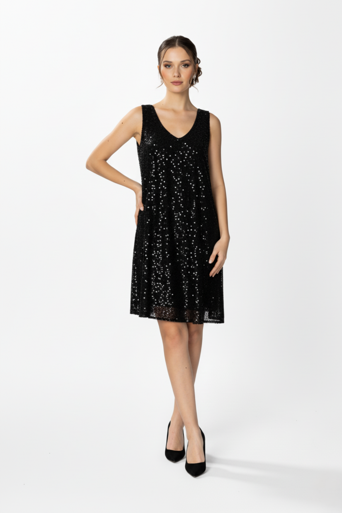 [Kumaş Bilgisi] Ürünün yüksek kaliteli ve hafif yapılı kumaşının adı Payet'tir. Kompozisyonu %95 Polyester, %5 Elastan olan kumaş ışıltılı ve dökümlü bir görünüme sahiptir. Sık şekilde düz sıralı olarak dokunmuş pullarının çapı 3 mm'dir. Bu ürünün iç kısmında, yumuşak, nefes alabilen ve esnek yapılı 70 denye jarse astar kullanılmıştır. Bu sayede son derece konforlu olan ürün iç göstermez, vücut hatlarını belli etmez ve her mevsim kullanıma uygundur.
