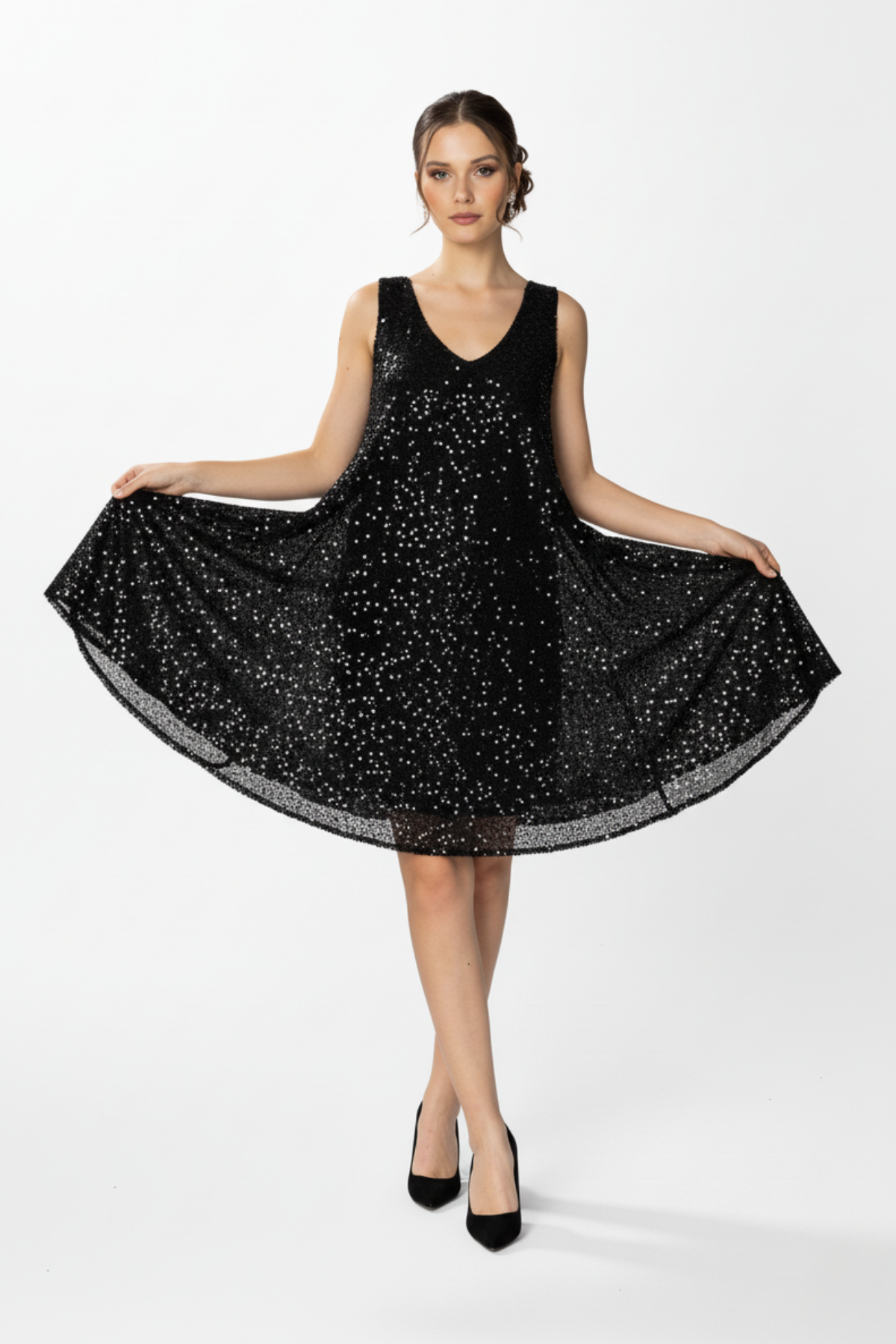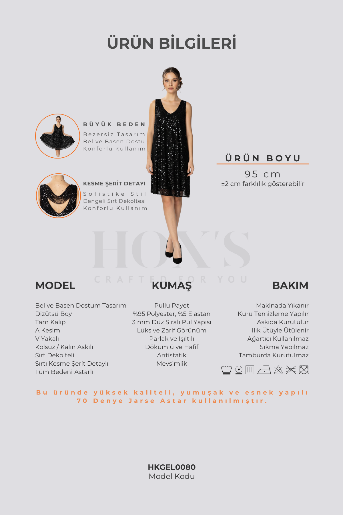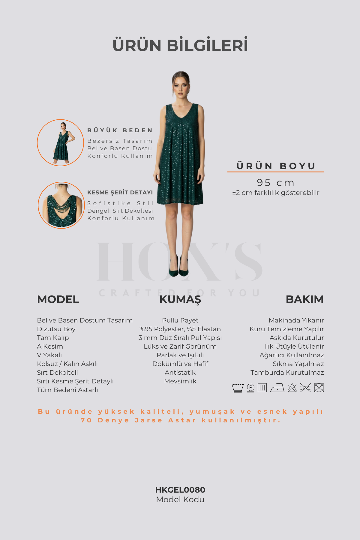 Zarif tasarımı, bel/basen dostu kesimi ve sofistike sırt dekoltesiyle büyük bedenler, hamileler ve göbek/basen sorunu olanlar için benzersiz olan bu Payetli V Yaka Sırt Dekolteli Kolsuz Dizüstü Hamile Abiye Elbise, bulunduğunuz ortamın yıldızı olmanız için tasarlandı. Ürün, her tür davet ve organizasyonda rahatlıkla kullanabileceğiniz çok yönlü bir seçenek olarak gardırobunuzun vazgeçilmezi olacak.