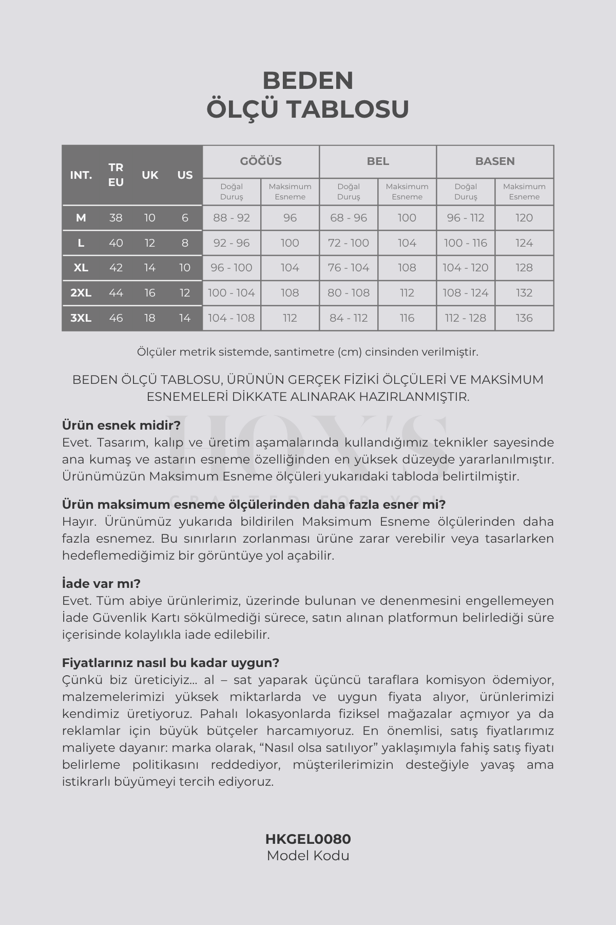 [Kalıp Bilgisi] Ismarlama kadar iyi... HOX'S Kalıp Standardı, çok yönlü araştırmalardan elde edilen veriler ve 30 yıllık benzersiz bir tecrübenin birleşiminden doğdu. Bu elbise A kesim olup, büyük bedenler, hamileler ve göbek/basen sorunu olanlar için tasarlandı. Beden Ölçü Tablosu, ürünün gerçek fiziki ölçüleri ve maksimum esnemeleri dikkate alınarak hazırlanmış olup, ürün görsellerinin sonunda yer alır. Mezurayla alınmış güncel vücut ölçülerine en uygun bedenin seçilmesini öneririz. Eğer vücut tipi nedeniyle (elma, üçgen, dikdörtgen) iki beden arasında kalınıyorsa, büyük olan beden tercih edilmelidir. Endişe etmeyin! Tüm HOX'S ürünleri, bir terzide vücut tipine kolaylıkla uyarlanabilecek şekilde tasarlanır.