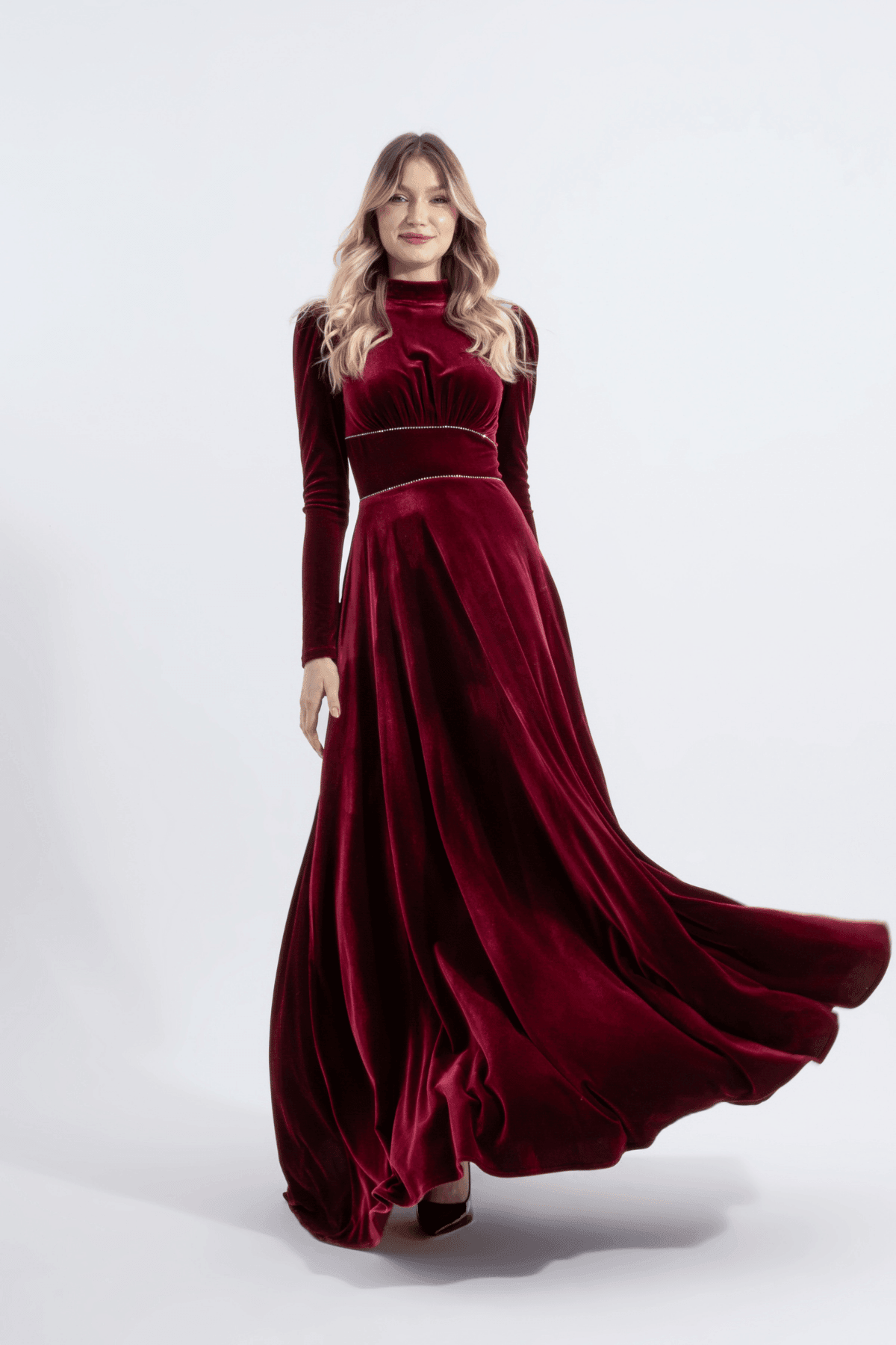 [Ürün Bilgisi] Konforlu bir kullanım deneyimi için tasarlanan bu premium elbise, maxi boy, tam kalıp, kloş kesim, dik yakalı, tül dolgulu yüksek omuzlu, omuz uçları büzgülü, uzun kollu, göğüs altı büzgülü, önü iki sıra taşlı şerit işlemeli, arkadan gizli fermuarlı ve tüm bedeni astarlı olarak üretilmiş olup, kadınsı ve elegan tarzı olan çok şık bir parçadır. Kutu içerisinde ve İade Güvenlik Kartı takılı olarak gönderilen ürün İstanbul'daki HOX'S tesislerinde yüksek kaliteli malzemeler kullanılarak ve sıfır hata yaklaşımıyla üretildi.