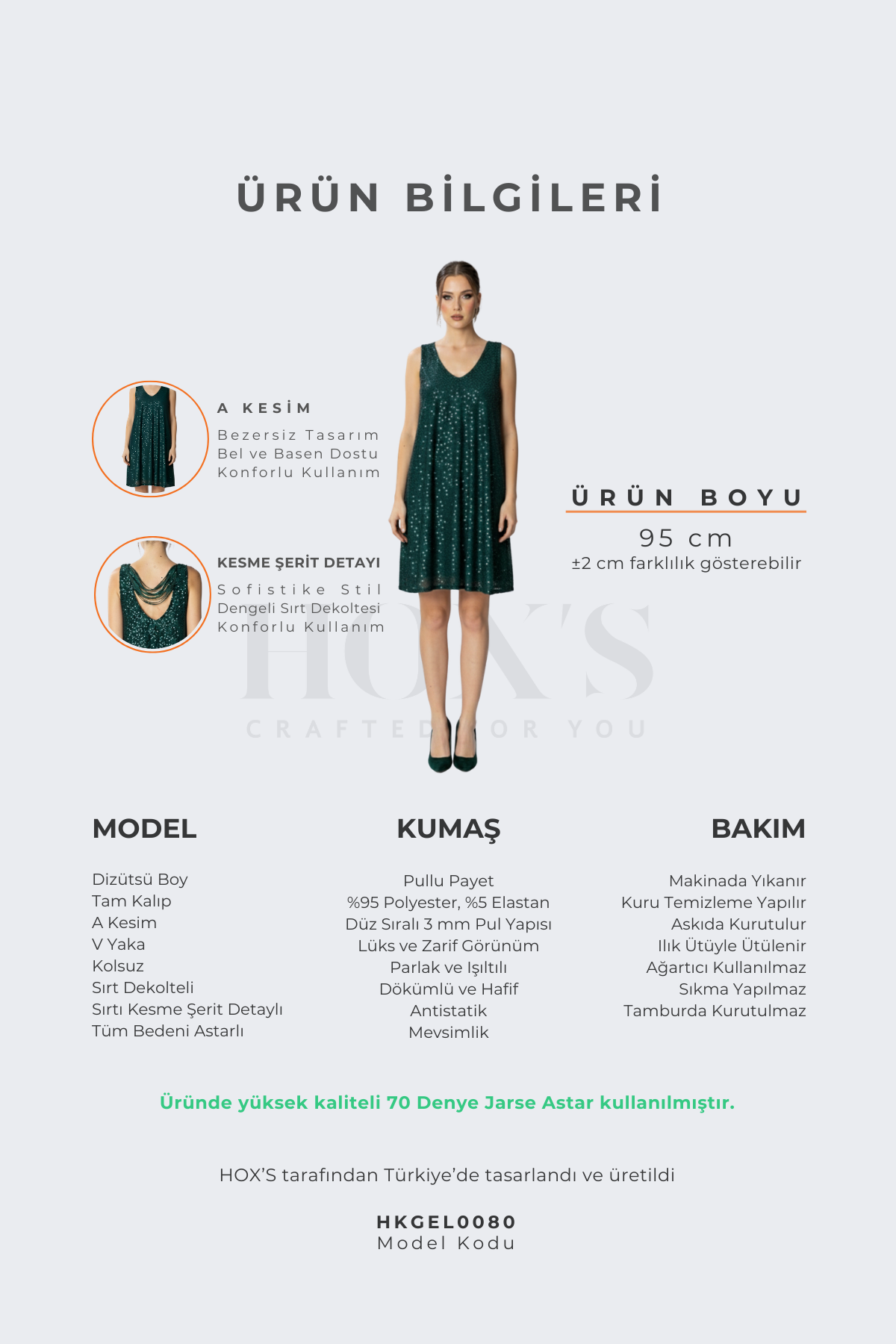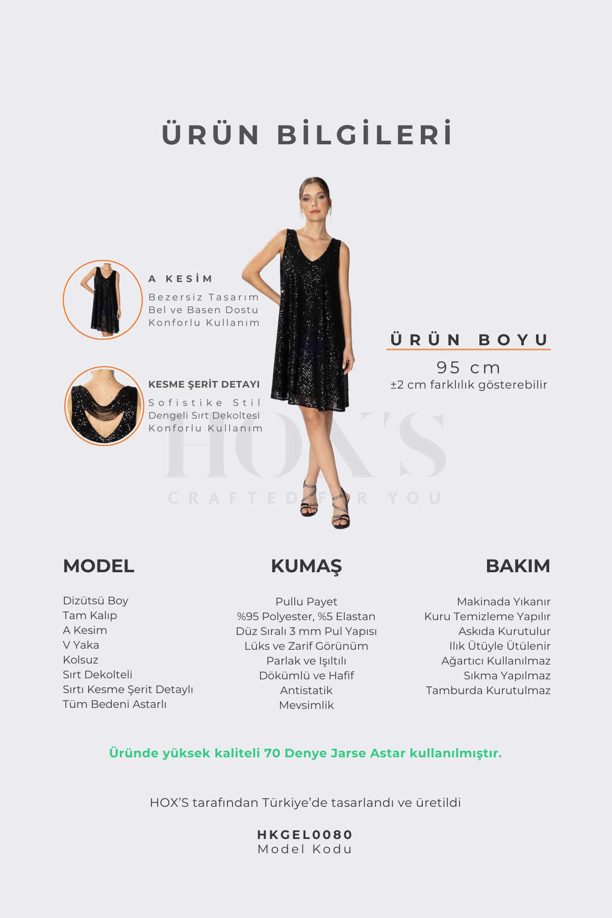 Это платье премиум-класса, созданное для комфортного ношения, имеет длину до колена, свободный крой, А-образный силуэт, V-образный вырез, открытую спину, вырез на спине, широкие бретели, без рукавов и полностью на подкладке. Это очень стильное платье с женственным и элегантным дизайном. Вечернее платье изготовлено из тщательно отобранных высококачественных материалов с соблюдением принципа отсутствия дефектов на фабриках HOX'S в Стамбуле, с использованием мастерства, основанного на древних традициях. Каждое изделие HOX'S – это драгоценное произведение искусства. Вечернее платье, в комплекте с карточкой возврата, прикрепленной специальной застежкой и лентой, упаковано в крафт-картон, защищенный от пыли, помещено в целлофановую упаковку и элегантно доставлено своему уважаемому клиенту в коробке.