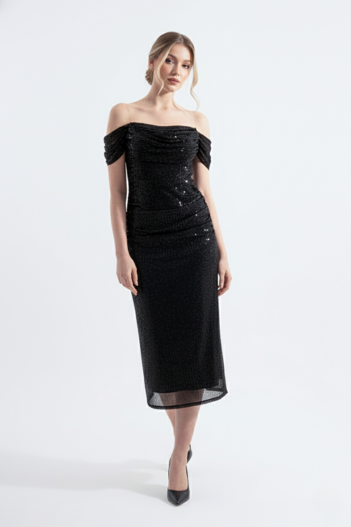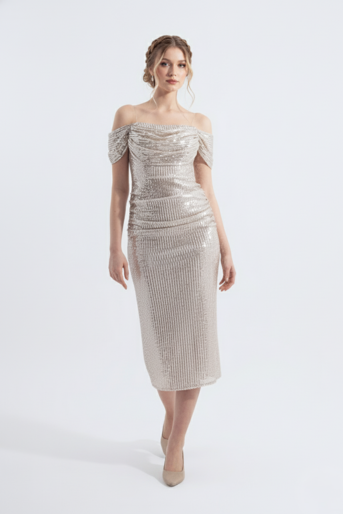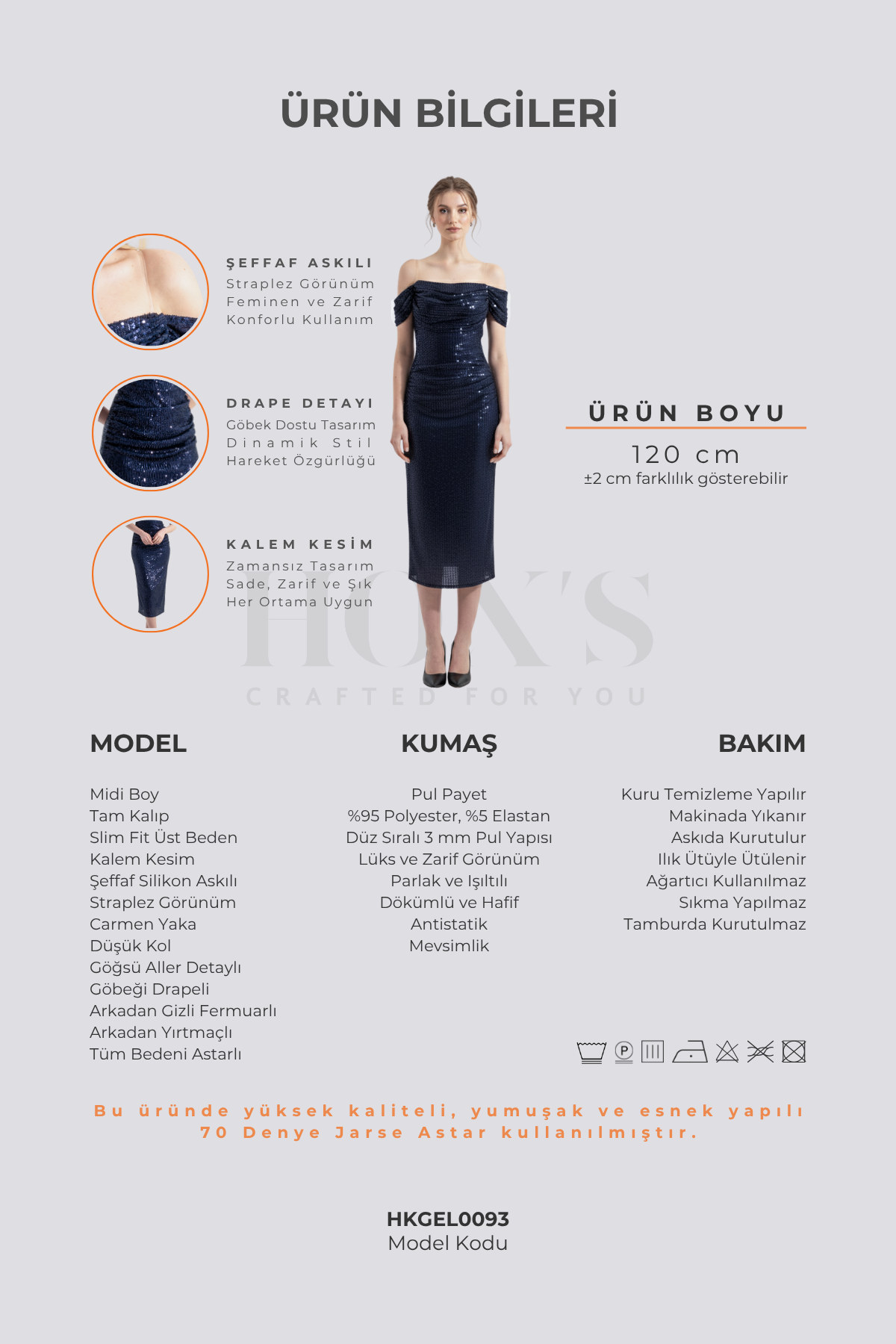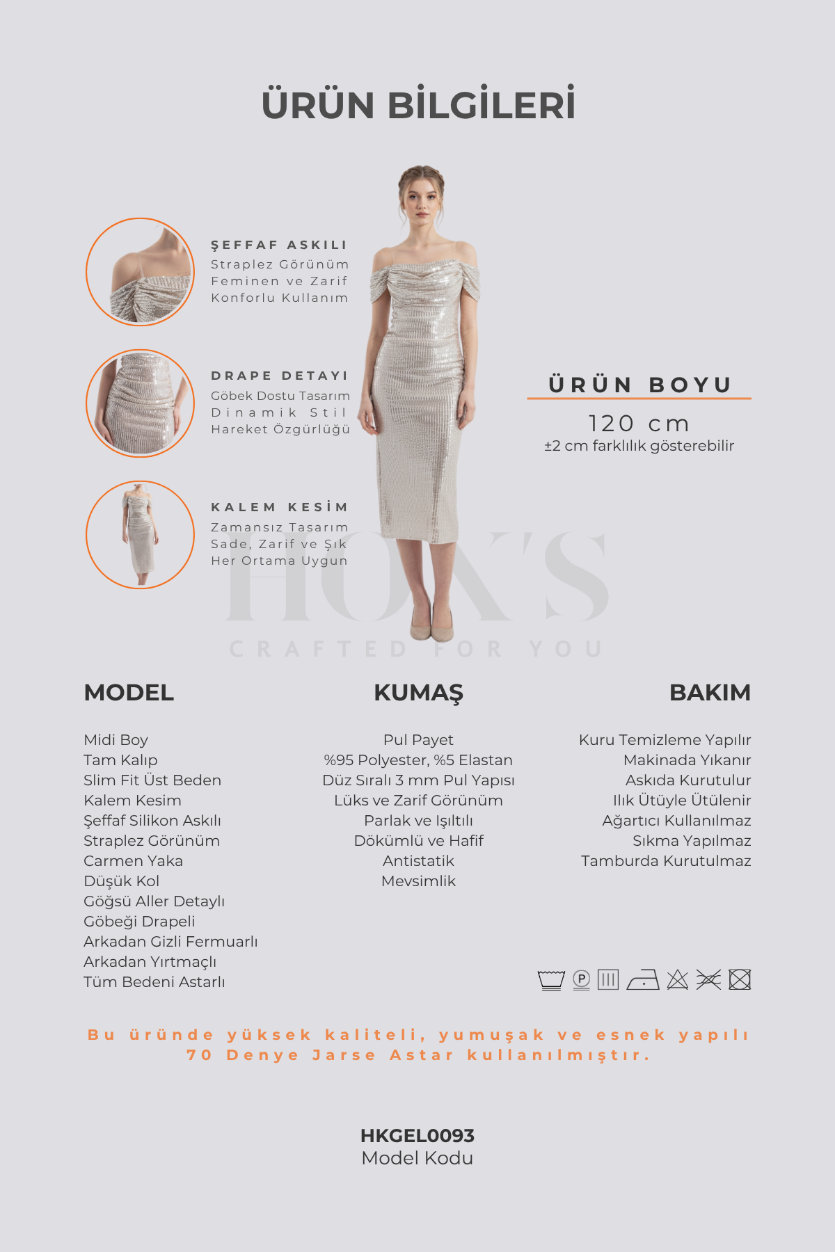[Информация о товаре] Это платье премиум-класса, разработанное для комфортного ношения, имеет длину миди, облегающую посадку, крой «карандаш», прозрачные силиконовые бретели, вид без бретелек, воротник «кармен», низкую спину, низкие рукава, отделку aller на груди, драпированный живот, разрез сзади, потайную молнию сзади и полностью на подкладке. Это очень шикарное изделие с женственным и элегантным стилем. Это вечернее платье было произведено с нулевым дефектом на фабрике HOX'S в Стамбуле с использованием тщательно отобранных высококачественных материалов, с мастерством, исходящим из древней традиции. Каждое изделие HOX'S - драгоценное произведение искусства. Это вечернее платье, к которому с помощью специального зажима и ленты прикреплена карта безопасности возврата, сложено в пыленепроницаемый крафт-картон и помещено в упаковочный желатин, прежде чем быть доставленным его ценному владельцу в очень элегантной коробке.